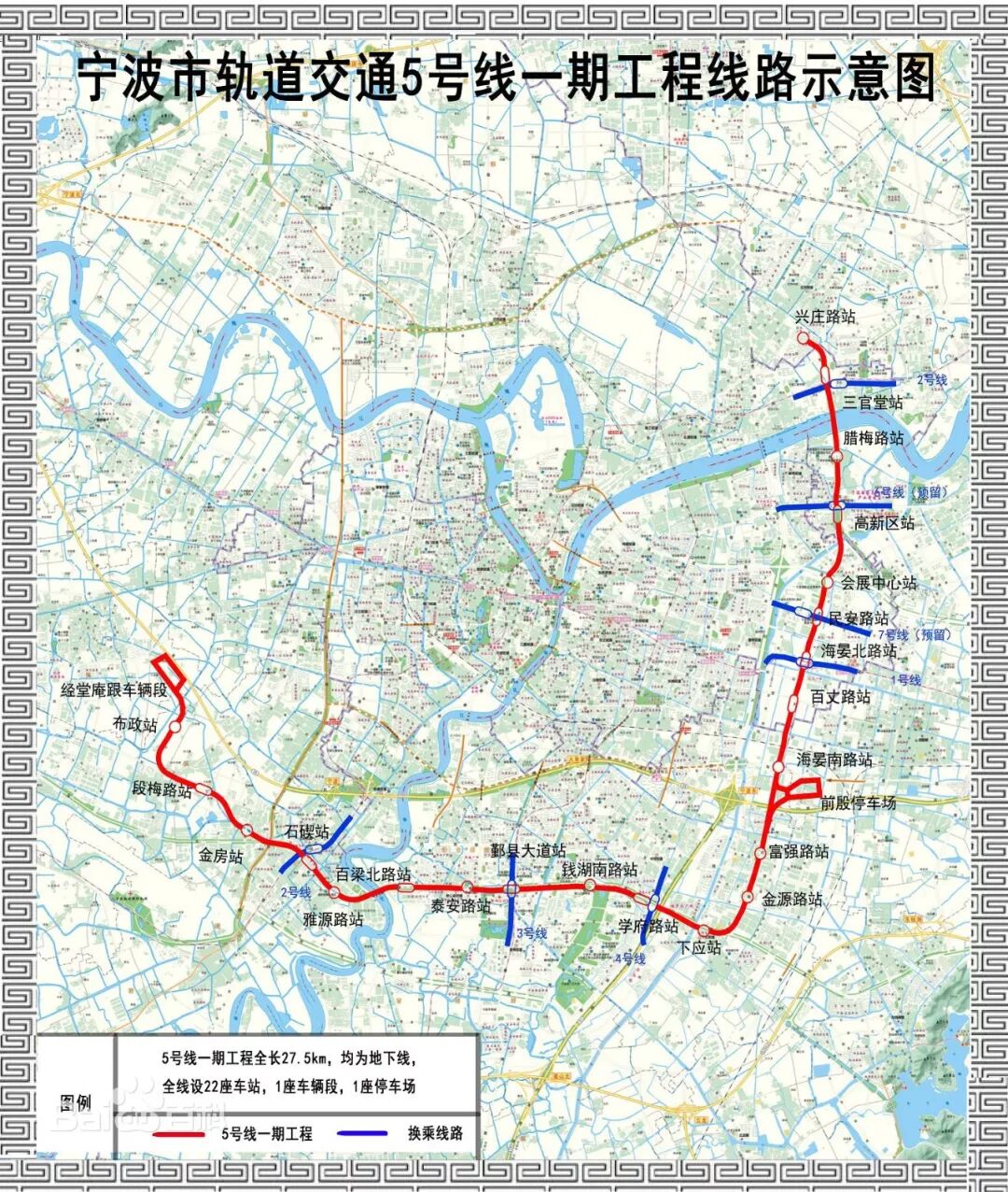 5号线一期全长约27.945km,设22座车站(含10个换乘站),均为地下站,平均站间距1.30km。